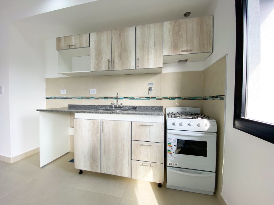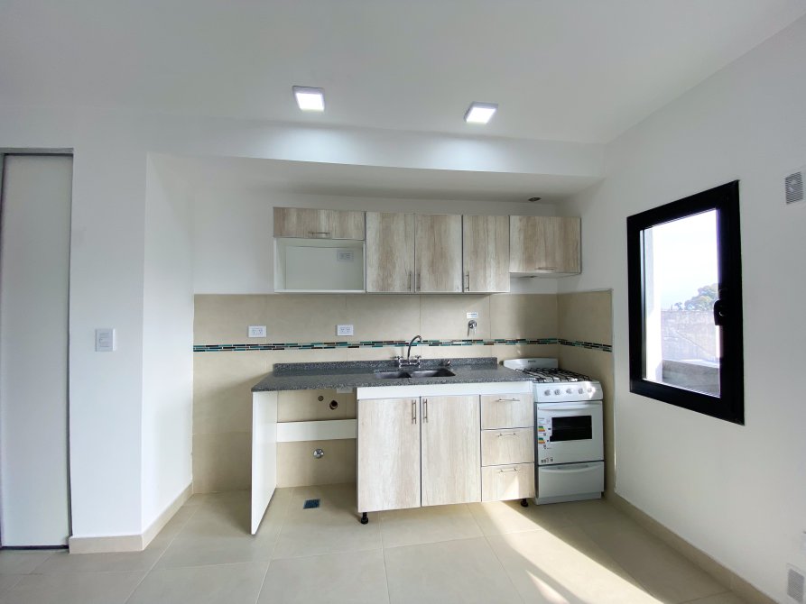 Cocina con ventana al frente, equipada con artefacto, conexión para extractor de aire, conexión para lavarropas, bajo mesada y alacena amplia de melamina con perfiles de aluminio, mesada de granito con bacha doble de acero