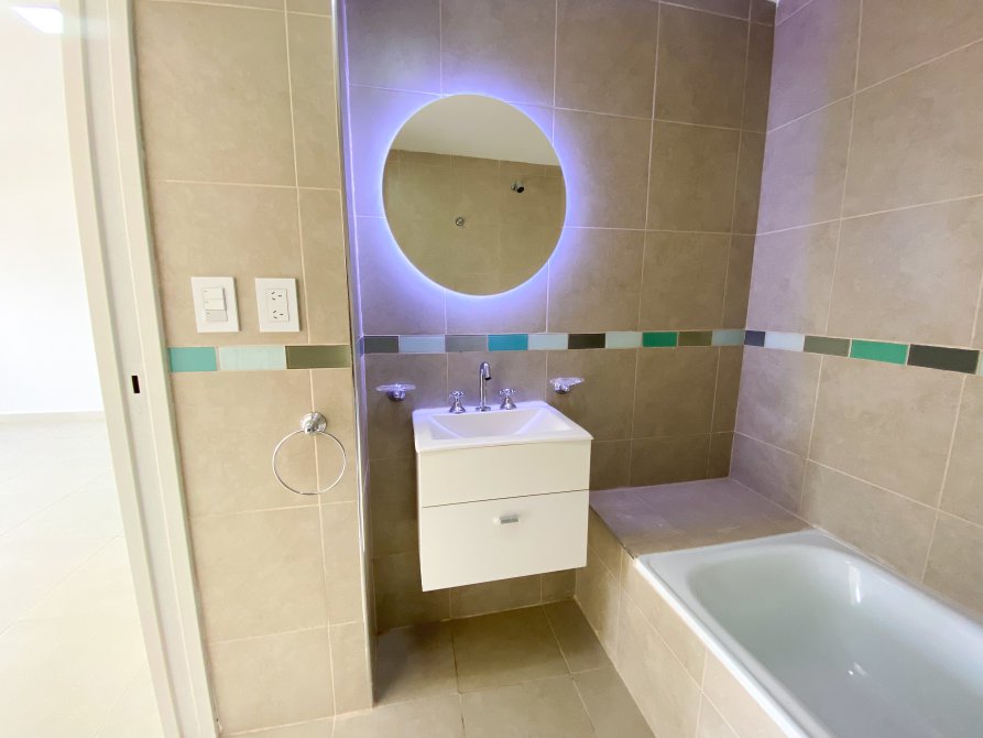 Baño completo con bañera, vanitory, espejo con luz led, inodoro y bidet, revestido en cerámica y guardas decorativas
