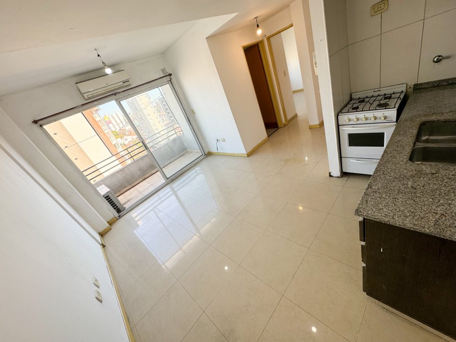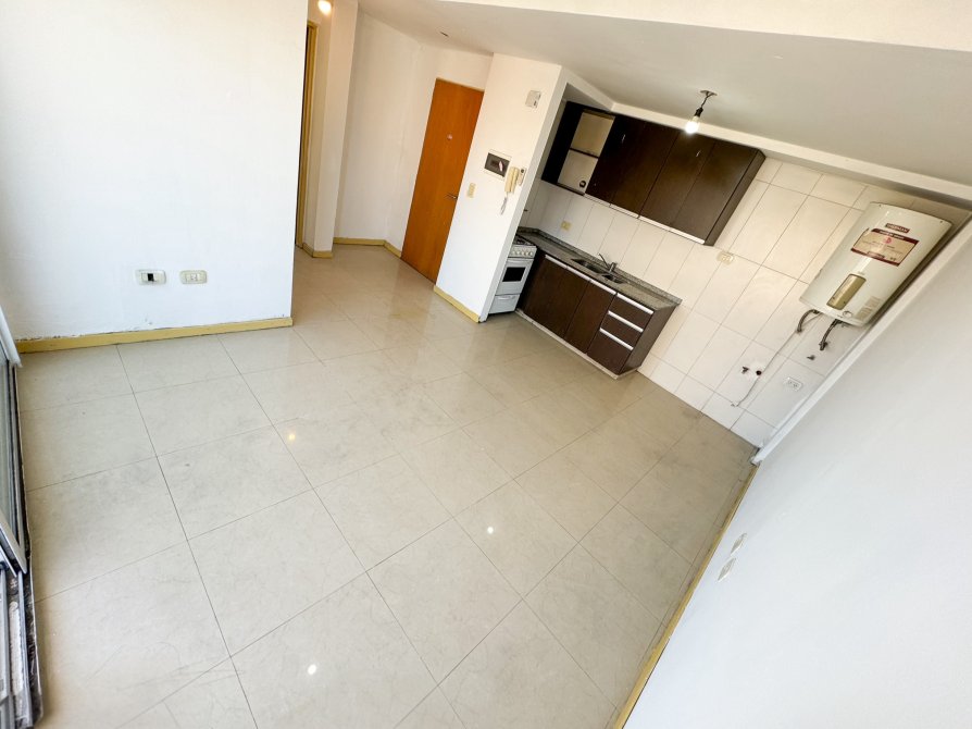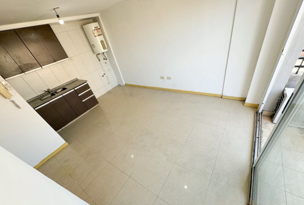 Living-Comedor-Cocina con piso de porcelanato, aire acondicionado split frío/calor, amoblamiento de bajo mesada y alacena de melamina, doble bacha de acero, mesada de granito, conexión para extractor de aire, termotanque eléctrico y conexión para lavarropas