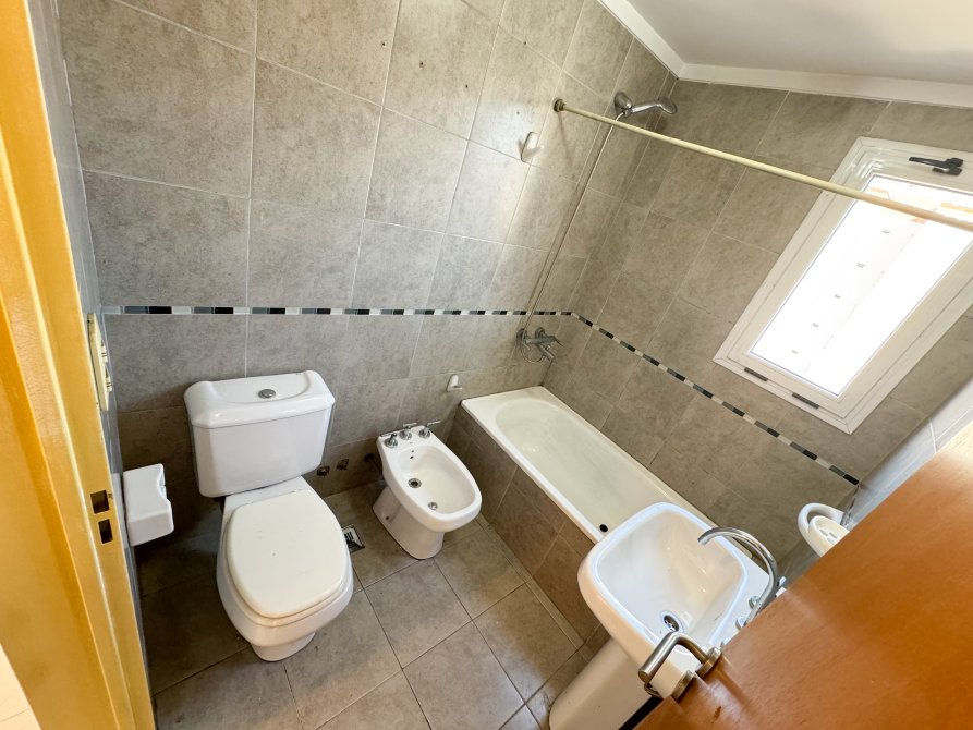 Baño completo con revestimiento cerámico, ventana, bañera, bacha de pie, espejo, inodoro y bidet